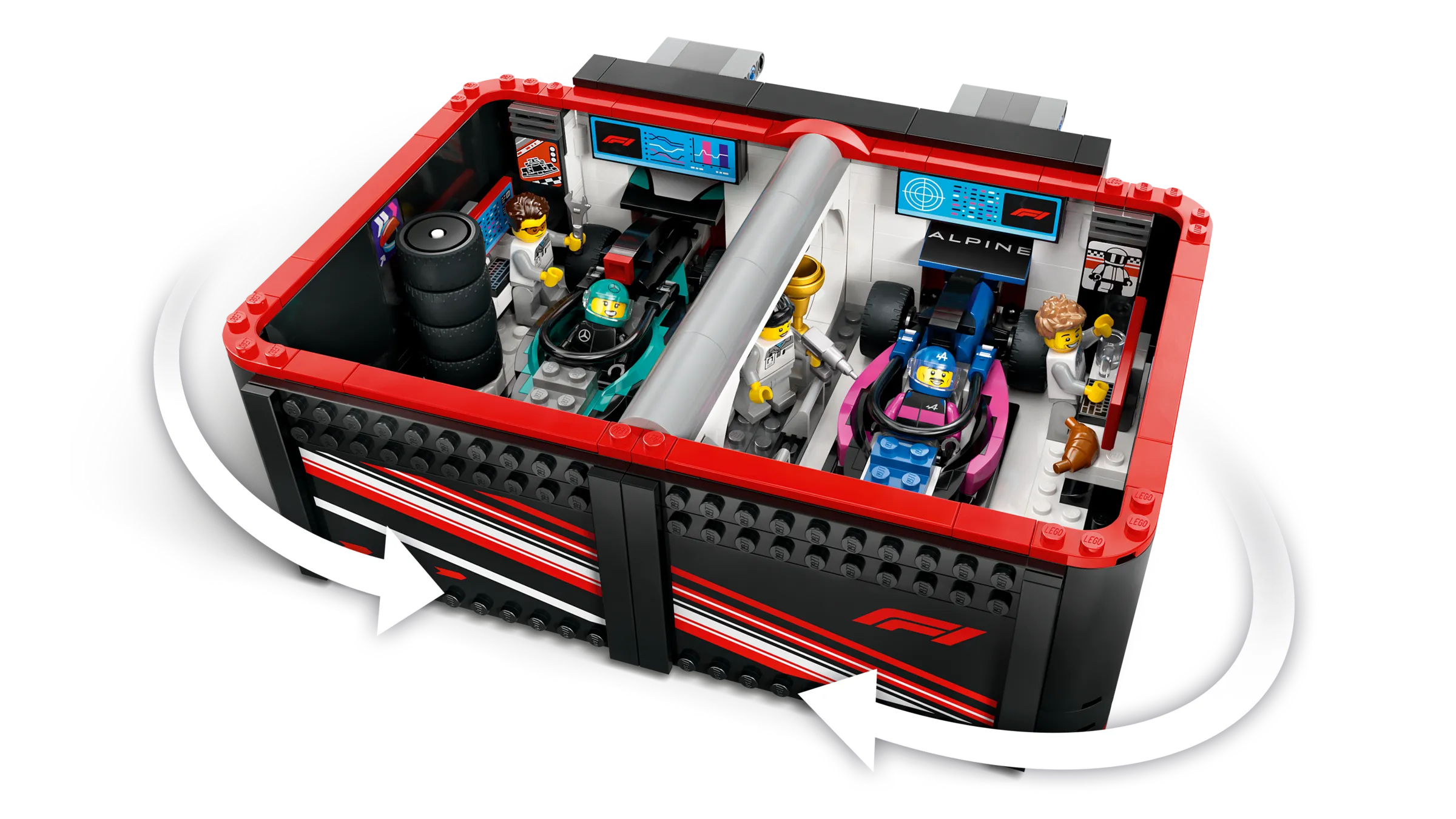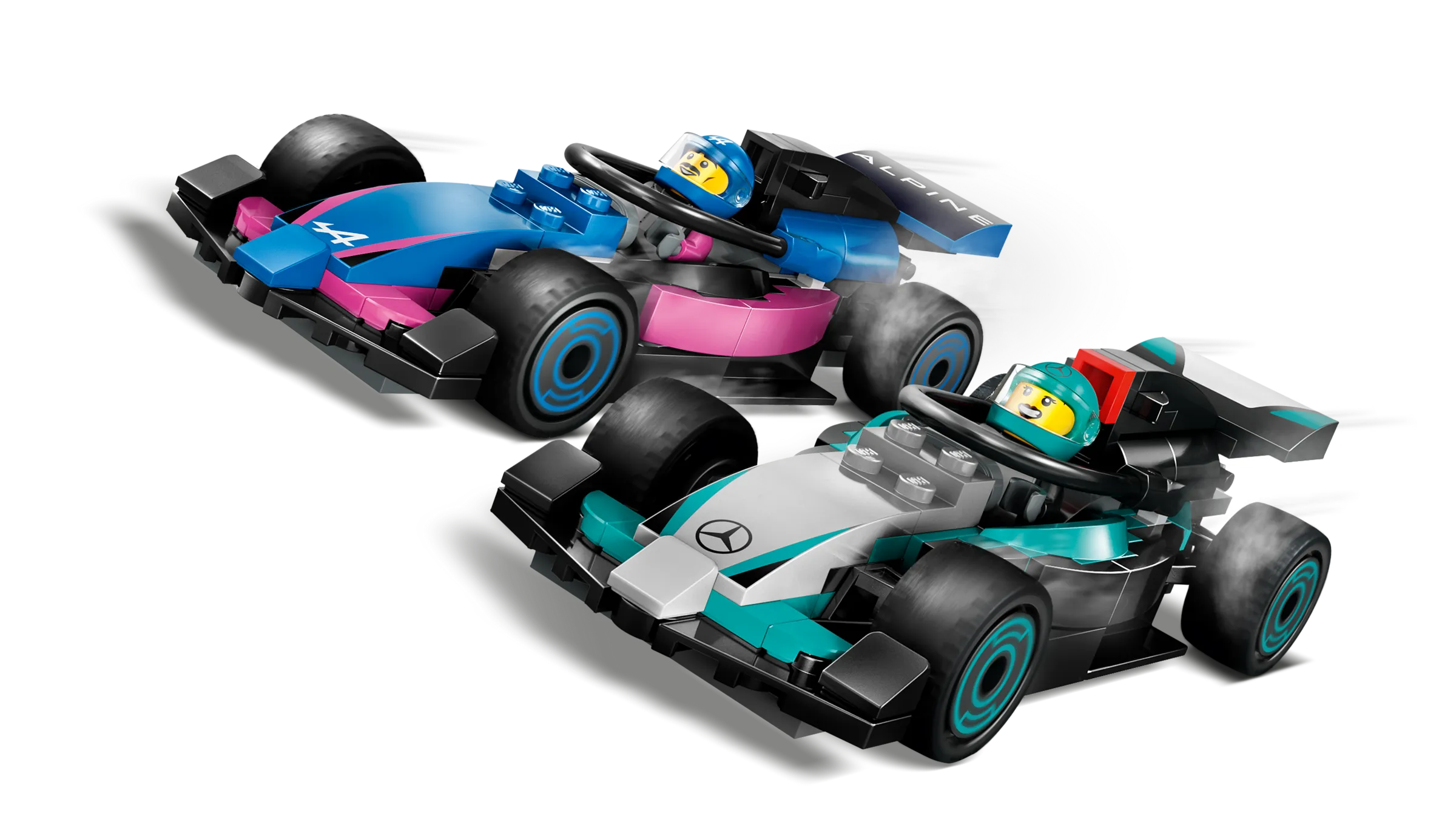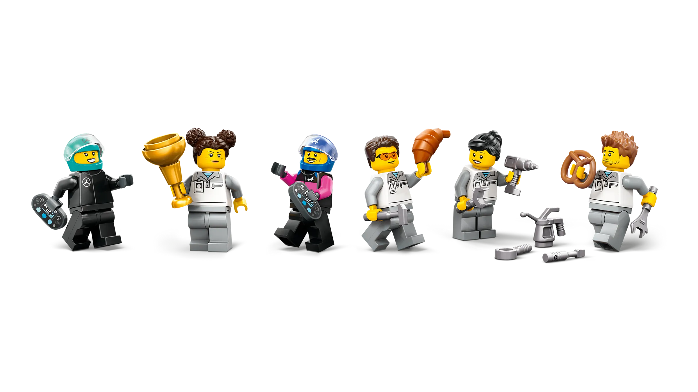 Willkommen in der F1® Garage. In dieser Werkstatt bereiten sich die Teams von Mercedes-AMG und Alpine aufs nächste Rennen vor! Es gibt einen Reifenturm, Werkbänke und Werkzeugwagen. Hilf den Mechanikern beim Feintuning der Rennautos. Rase dann ausden Startboxen los. Wer holt sich den Siegerpokal? Freu dich auf spannende Formel 1® Rennen in LEGO® City!