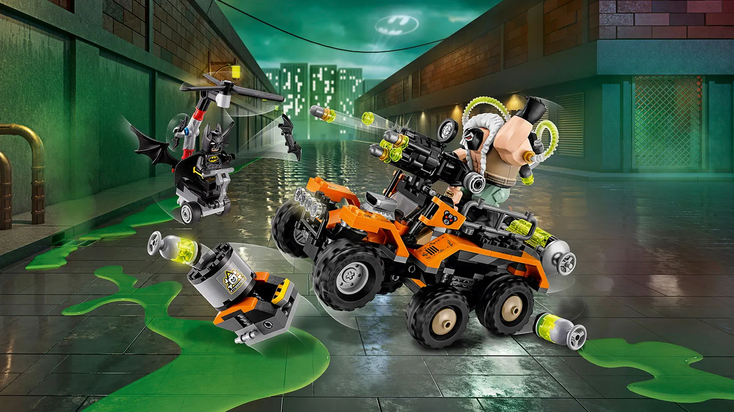 Bane™ richtet mit seinem Allradtruck großes Chaos in der Stadt an. Flieg mit Batmans Whirly-Bat zu Hilfe. Du musst schnell sein, um dem sechsschüssigen Schnellshooter des Trucks und den von Bane™ geworfenen Giftbomben auszuweichen. Hüte dich vor der Fackel von Mutant Leader und wehre dich mit dem Batarang. Bane trägt seinen Giftruftsack, der ihm noch mehr Kraft verleiht. Hindere ihn um jeden Preis daran, den riesigen Gifttank von dem Truck fallen zu lassen, und lass Mutant Leader bloß nicht die Giftmüll-Explosionsfunktion aktivieren.