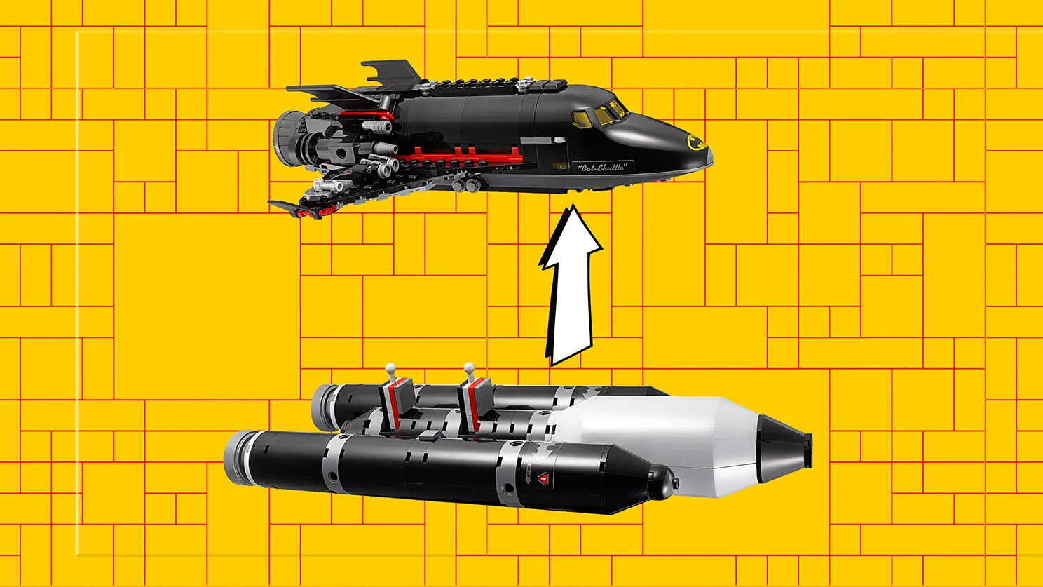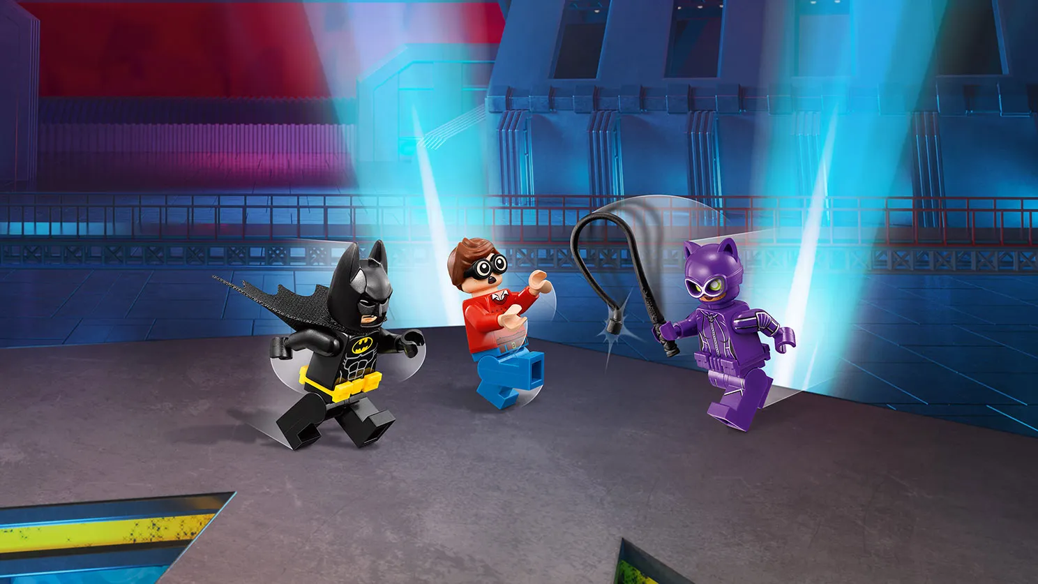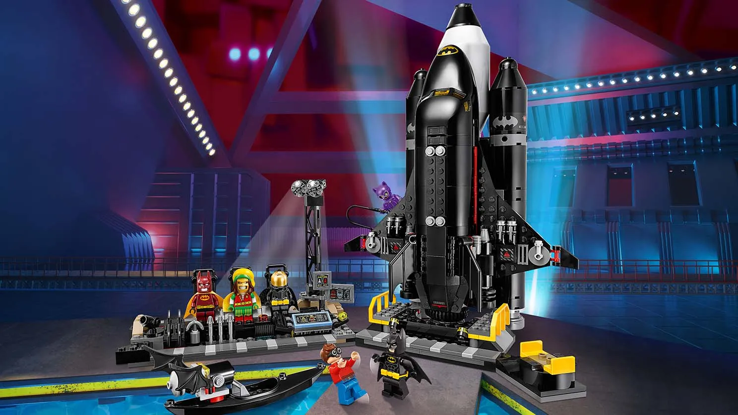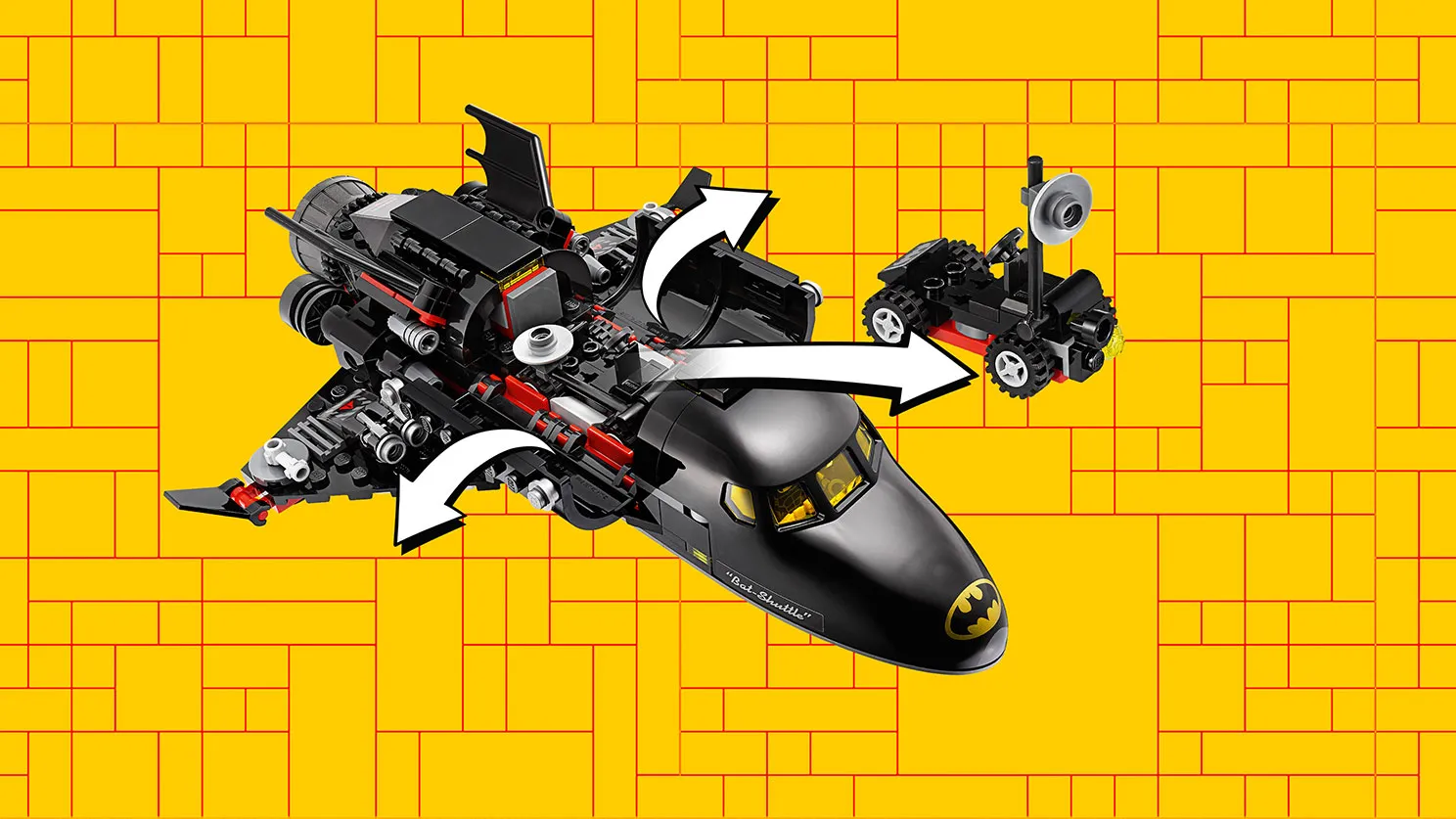 Mit dem „Bat-Spaceshuttle“ darfst du dich auf spannende Weltraummissionen freuen! Bereite dich mit Batman™ und Dick Grayson™ in der Bathöhle vor. Hüte dich jedoch vor der Superschurkin Catwoman™, die bei diesem Action-Spektakel auch heimlich mitmischen möchte. Benutze das Batkajak, um durch die Bathöhle zu paddeln. Nimm dir ein flippiges Outfit von der verschiebbaren Kleiderstange! Entscheidest du dich für den Reggae Man Batsuit, den Space Batsuit oder den Firestarter Batsuit? Du hast die Wahl. Schnapp dir einen Batarang, schwing dich ins Spaceshuttle-Cockpit und begib dich in die Umlaufbahn. Trenne die gewaltigen Dreifach-Booster ab, lande auf dem Mond und geh mit dem Bat-Mondbuggy auf Erkundungstour!