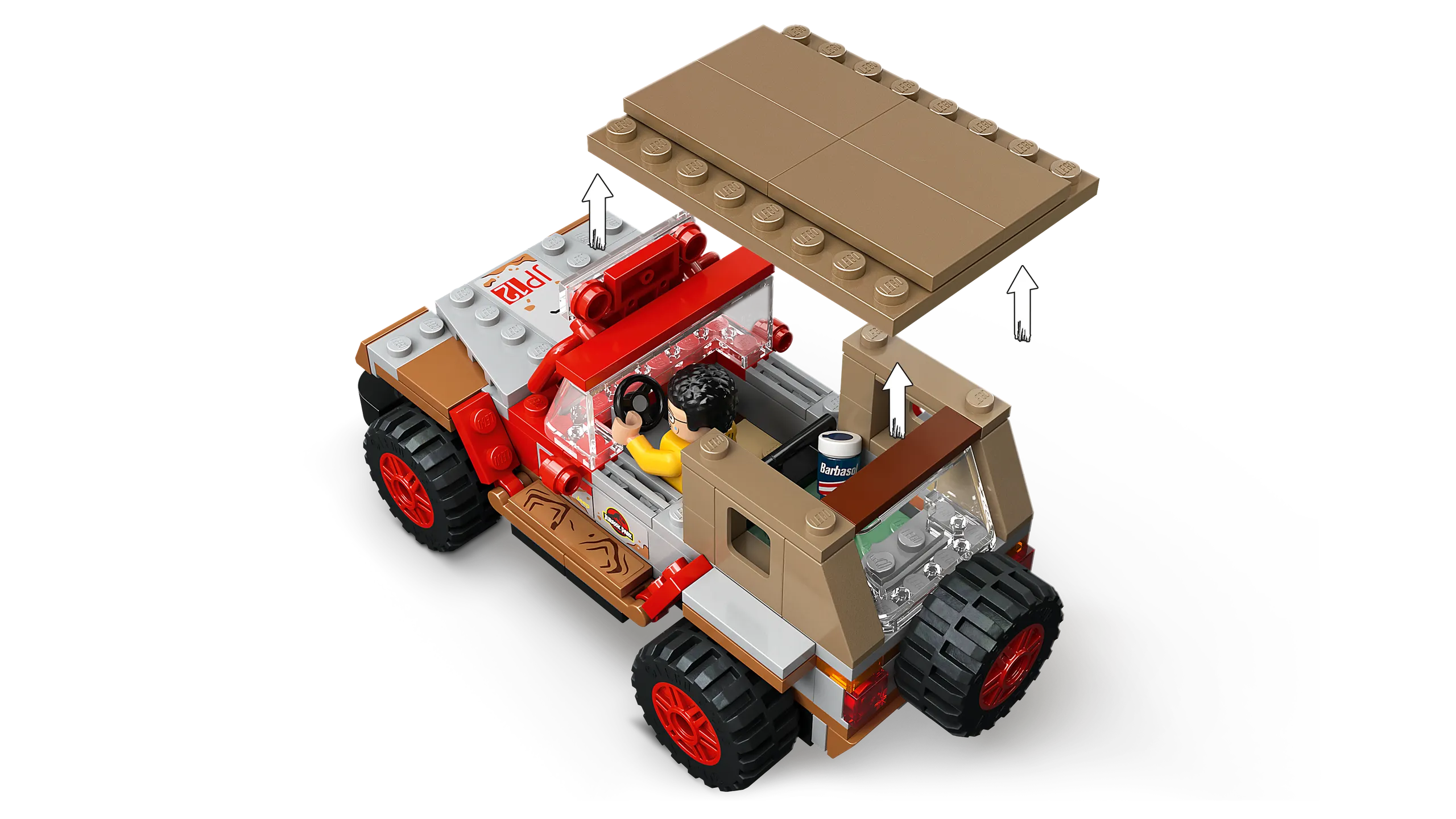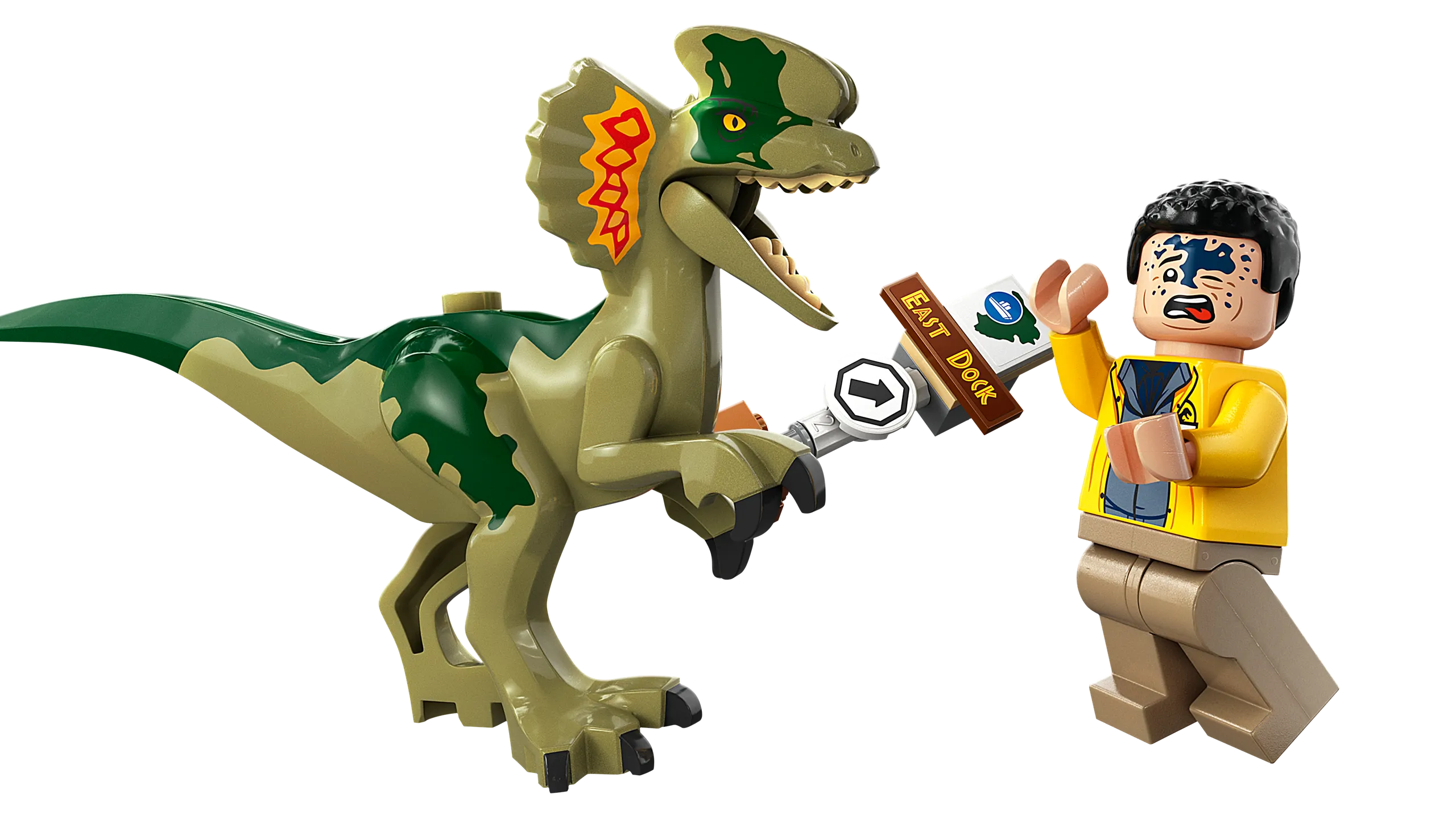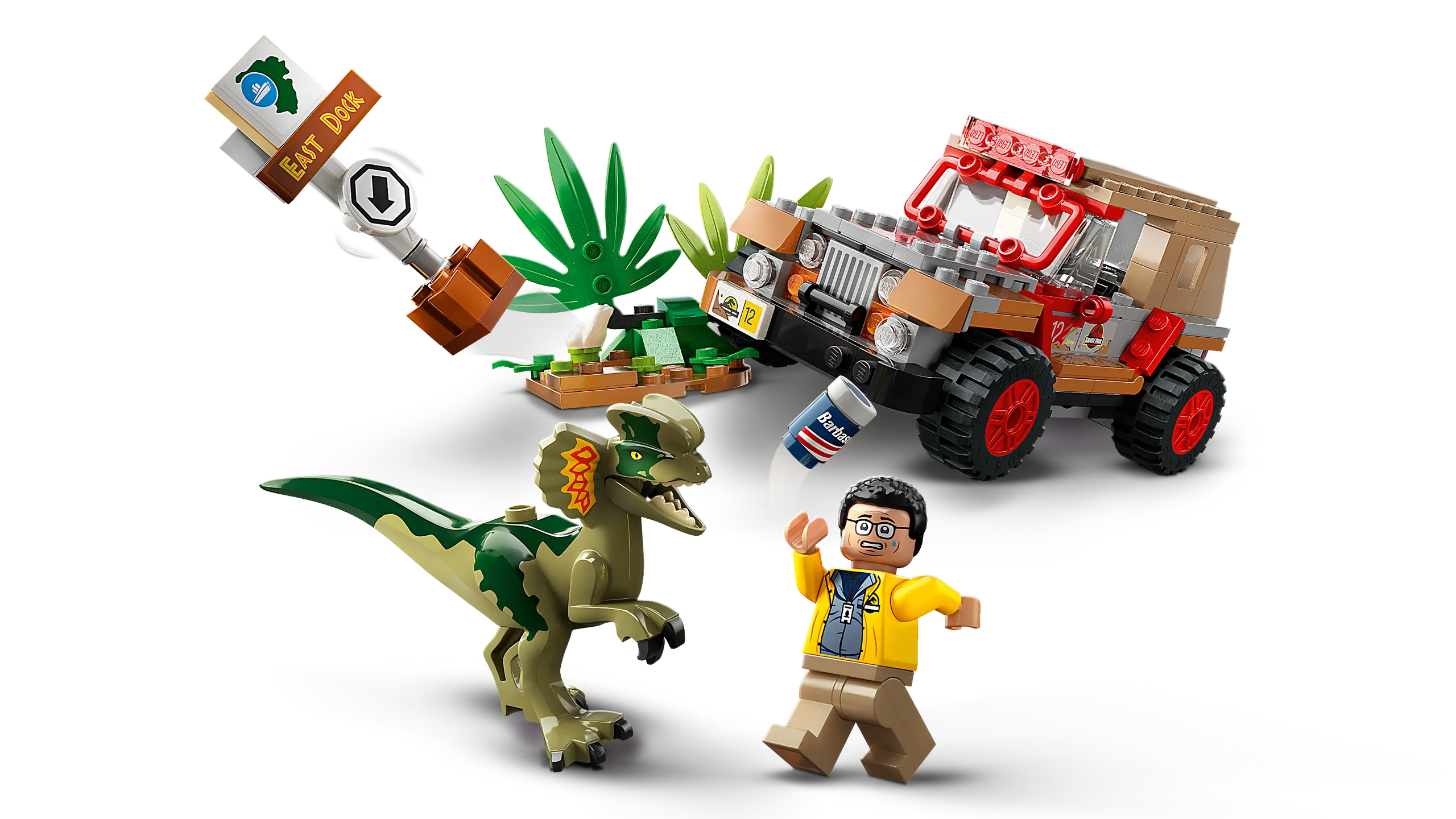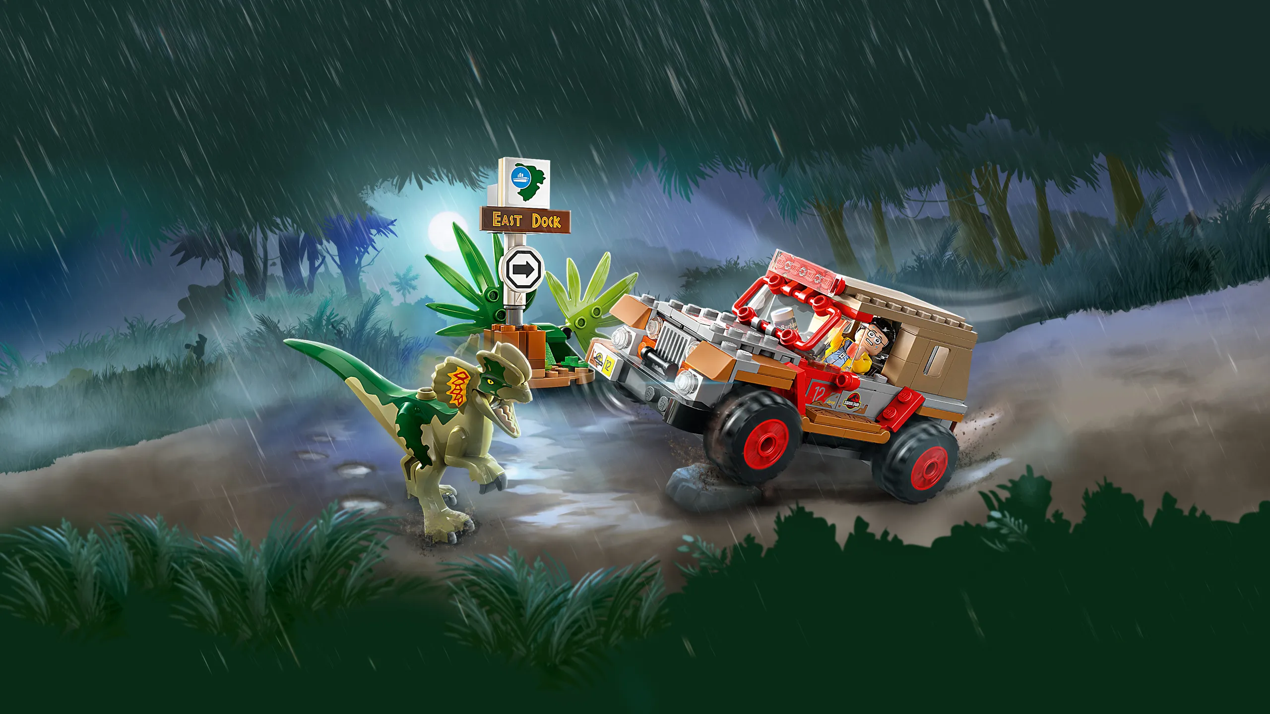 Dennis Nedry macht sich in seinem Jeep® mit einer Rasierschaumdose voll Dino-Embryos aus dem Staub! Doch es regnet so heftig, dass er auf dem Weg zum Hafen die Kontrolle über sein Auto verliert und einen Unfall baut. Schafft er es aus dem Auto heraus, bevor der Dilophosaurus angreift?