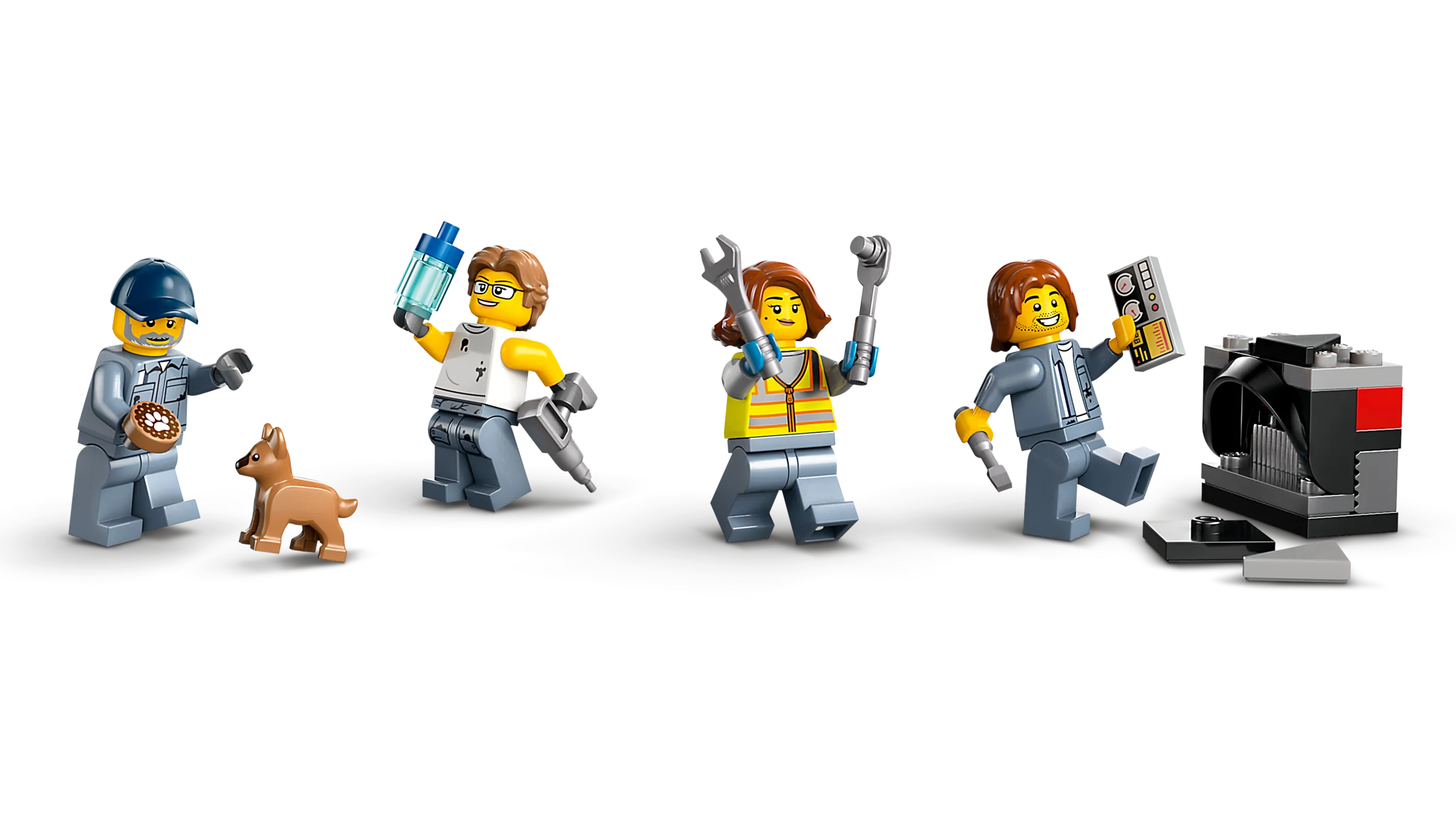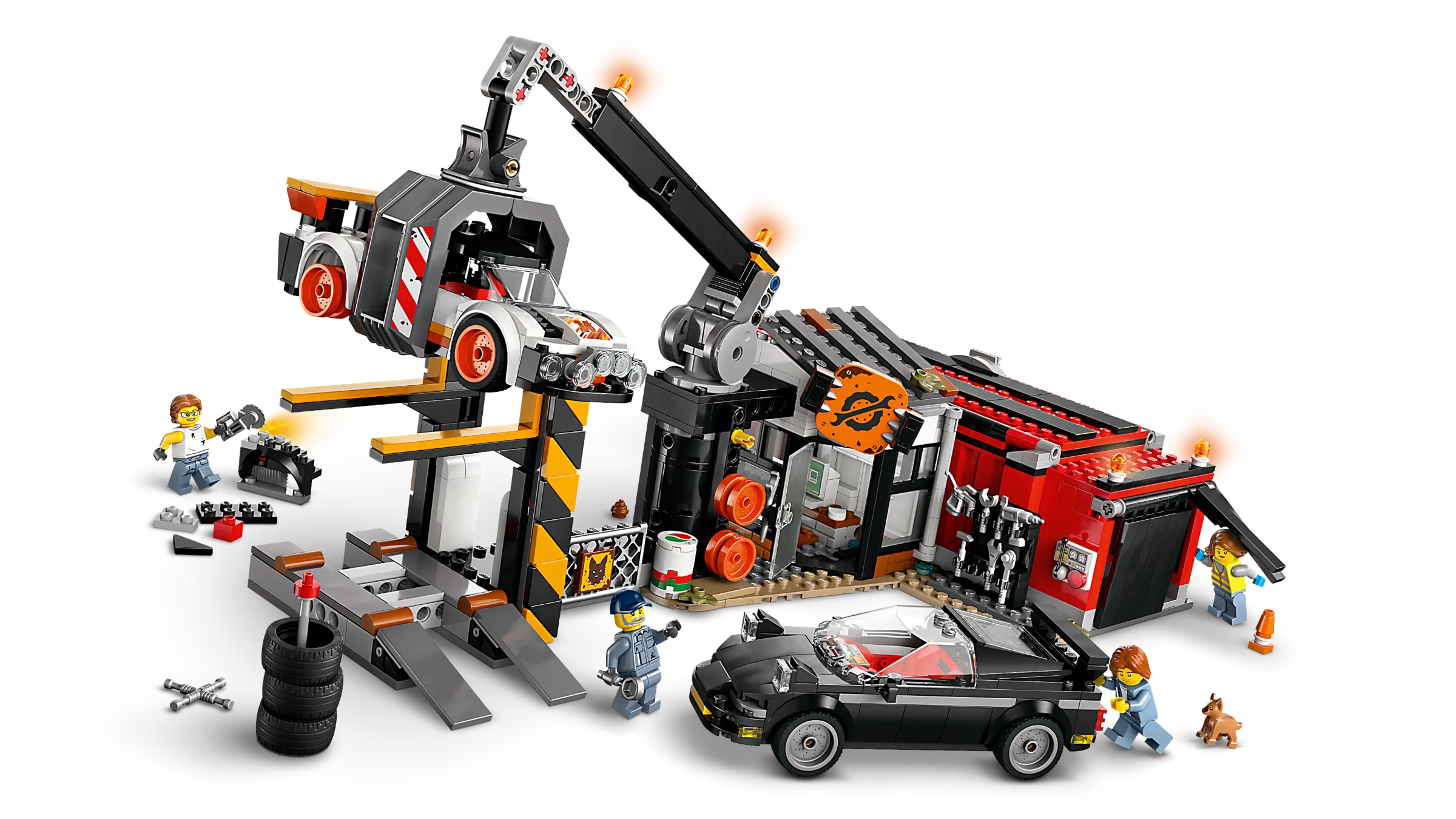 Welcome to the LEGO® City scrapyard, where the crew bring new life to old cars. Check out the shop selling salvaged spare parts, cool alloys and quality tyres at bargain prices! Grab a wrench from the tool chest and help dismantle parts from 2 classic ’80s cars. Then use the claw crane to hoist them into the crusher and press a lever to transform them into scrap metal cubes. Amazing!