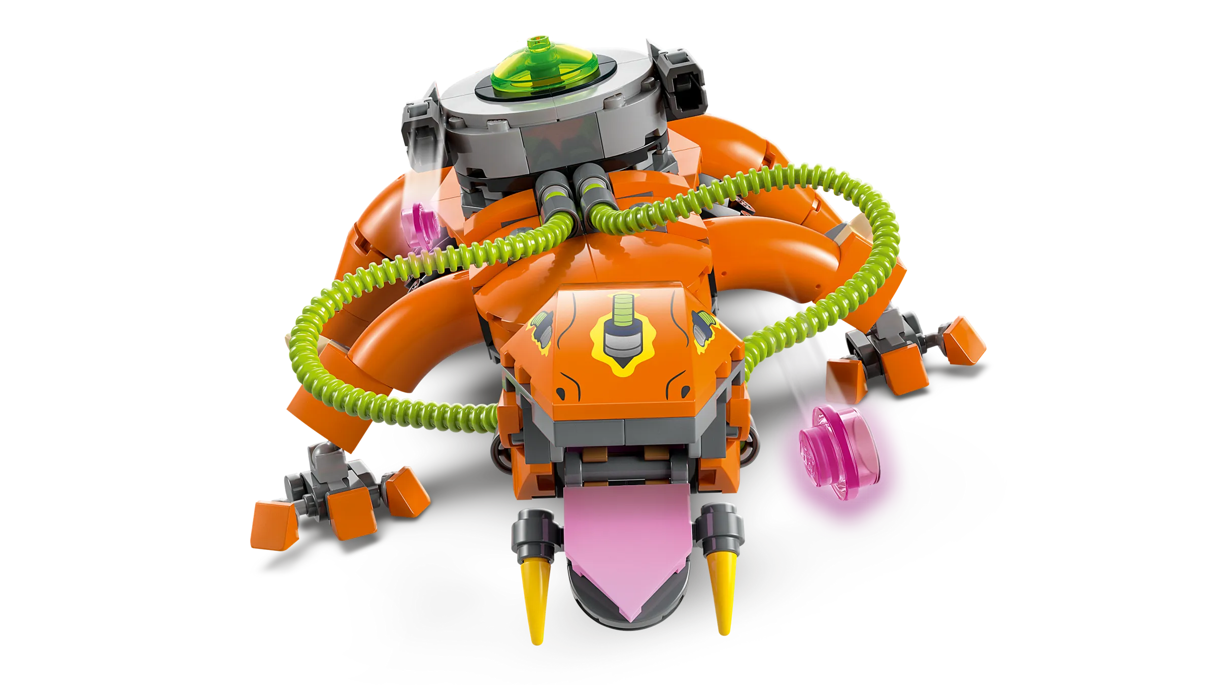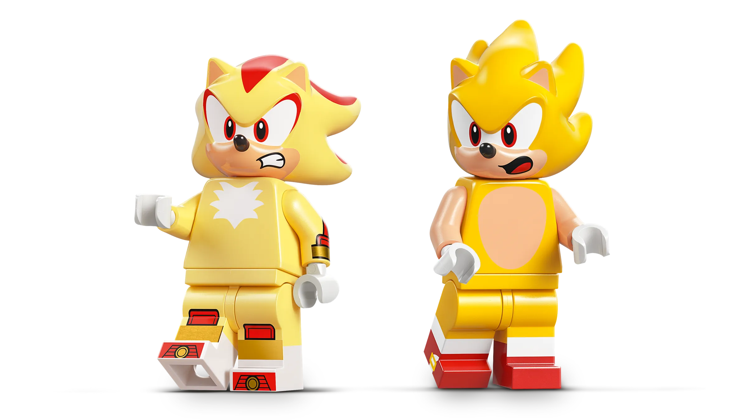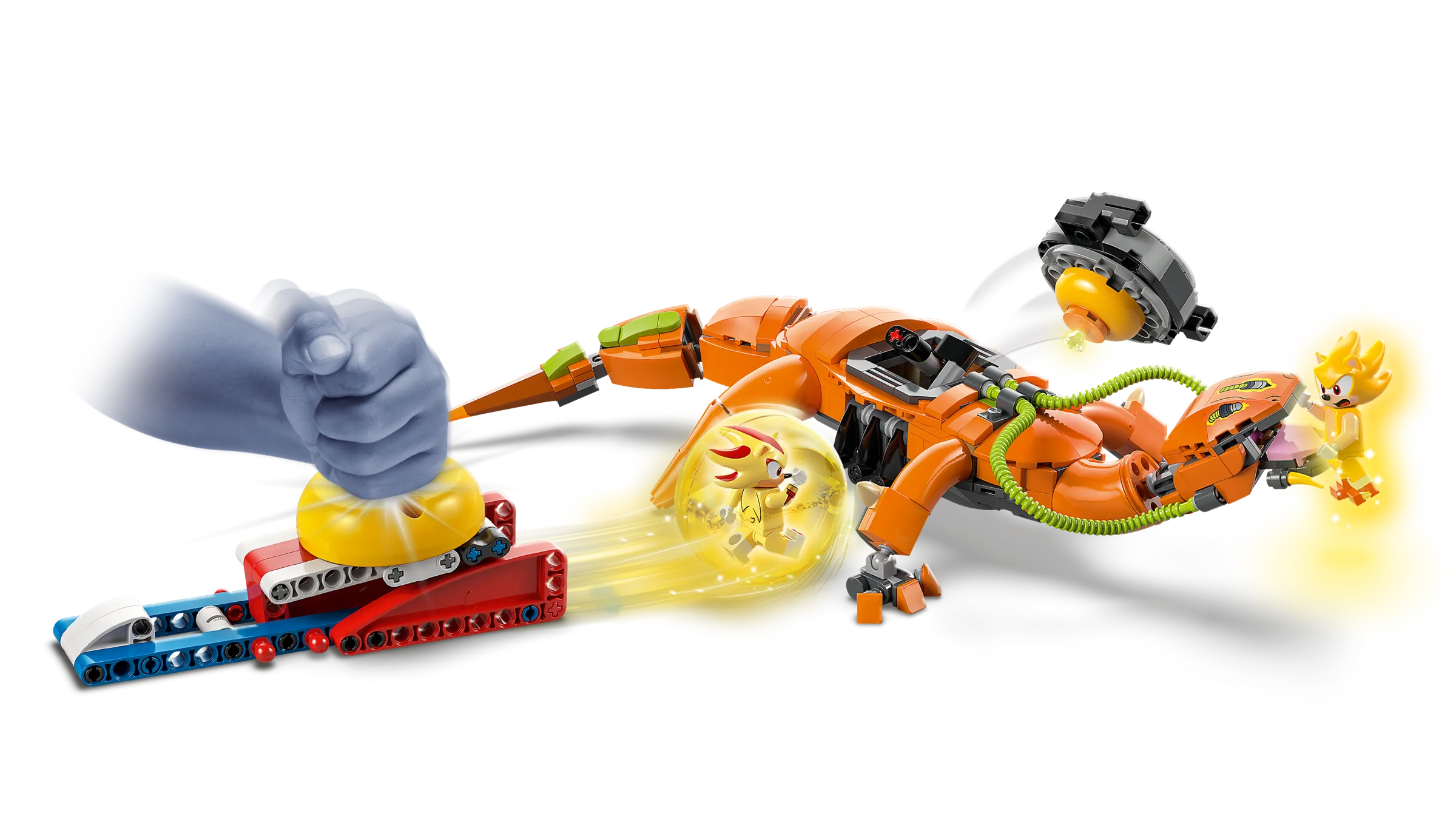 Battle the Biolizard! Load Super Shadow or Super Sonic into the speed sphere launcher and help defend the Space Colony ARK from the Biolizard. Be careful, it’s got stud launchers ready to fire, along with its tail and powerful jaws. Aim for its weak point on the side, knock off the energy pod and recover the Chaos Emerald to power down the enemy. So, who’s fastest, Super Shadow or Super Sonic?