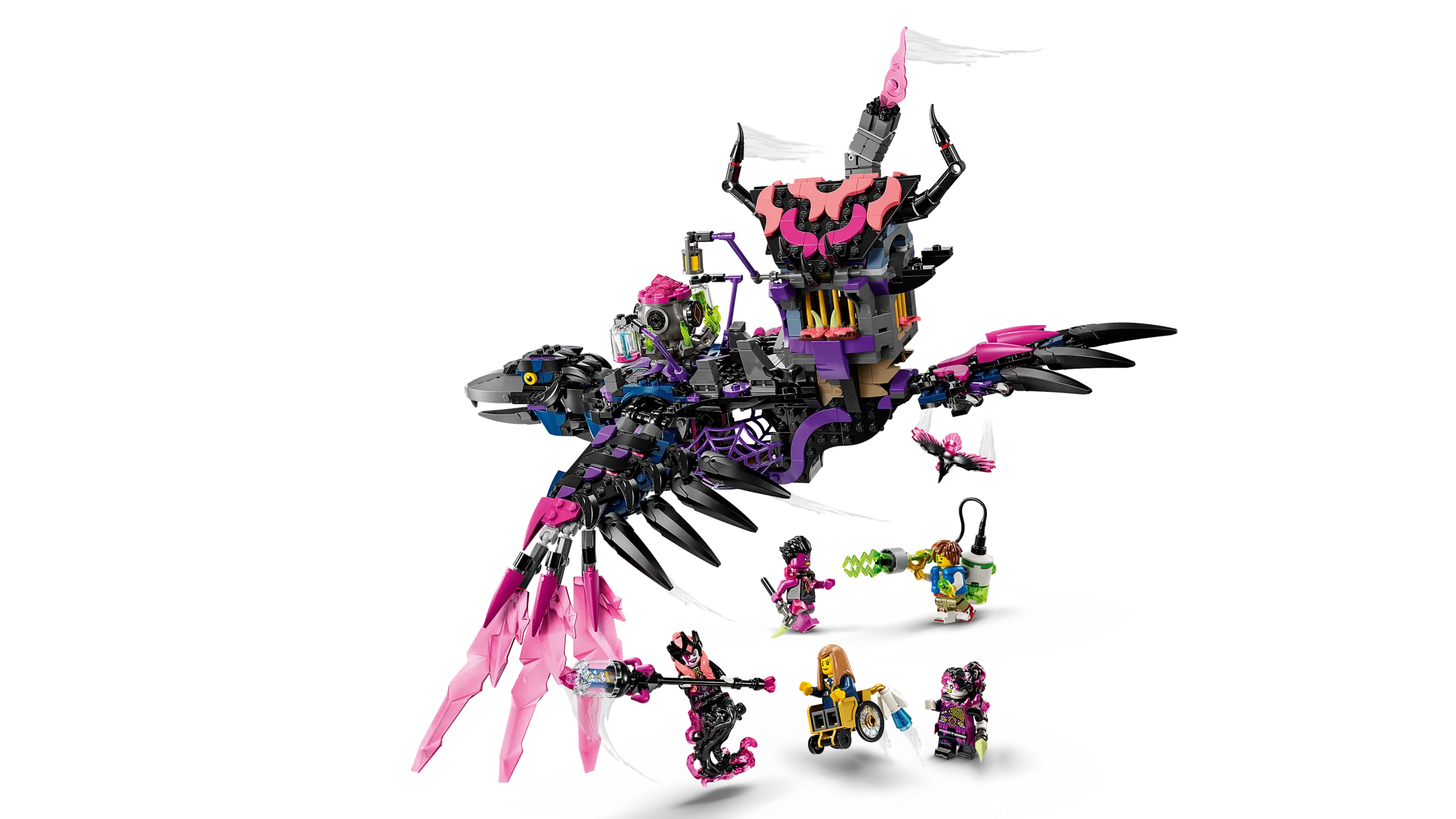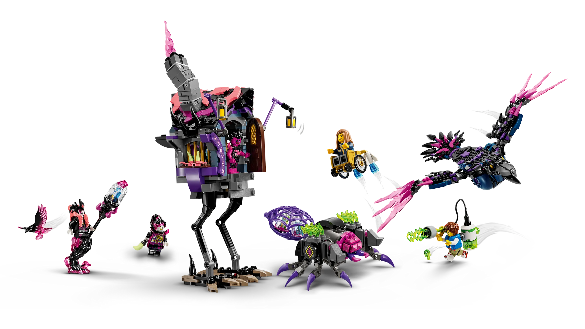 The Never Witch is capturing dream realms in her dream jars and using them for evil magic! Have fun building her awesome raven before transforming it into a raven-hut combination or rebuilding it as a collection of 3 cool creature toys: a walking house, a cauldron spider and a giant raven! You can then join forces with Mateo and Astrid to help defeat the villainous witch and stop her evil plans!