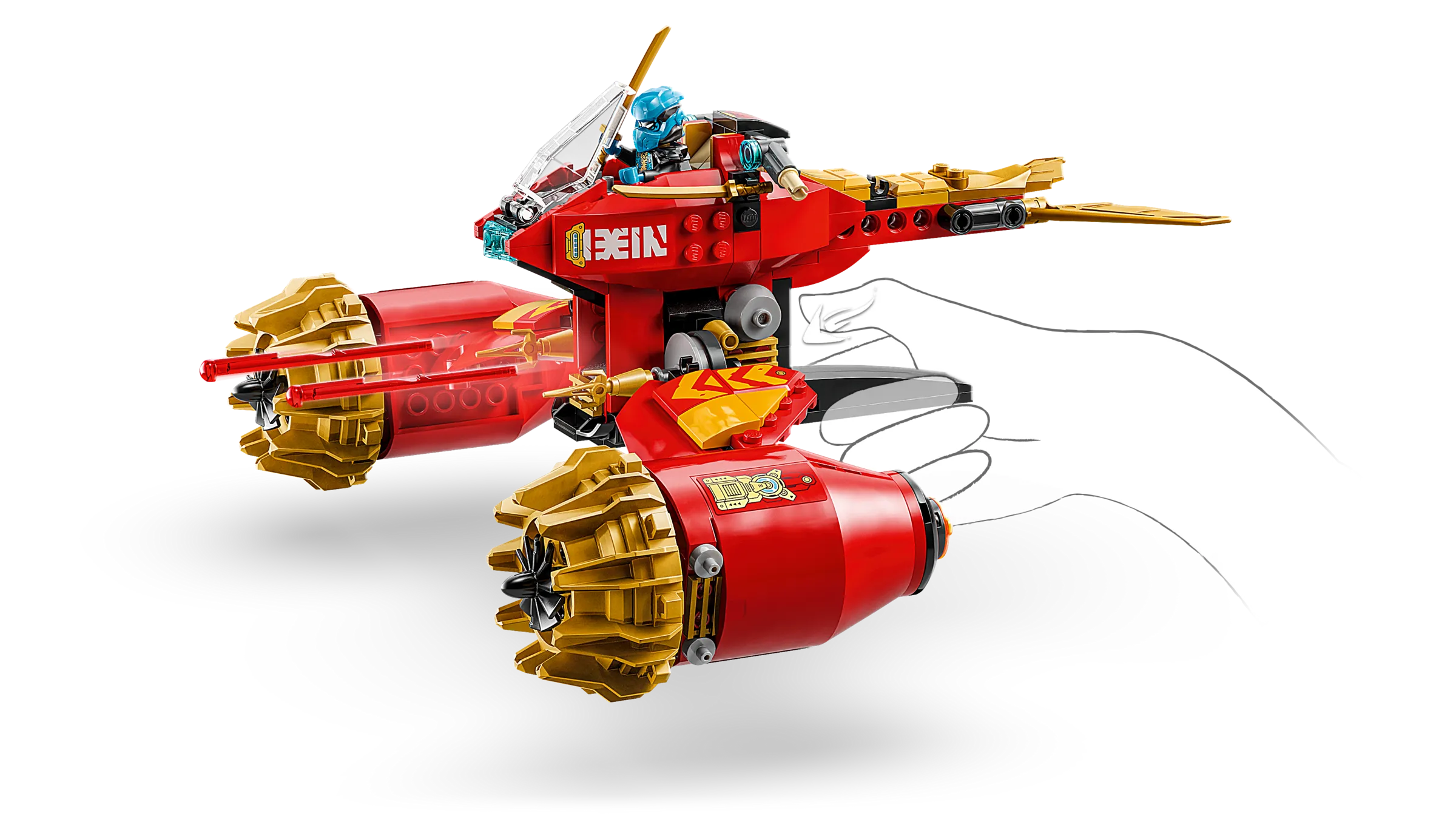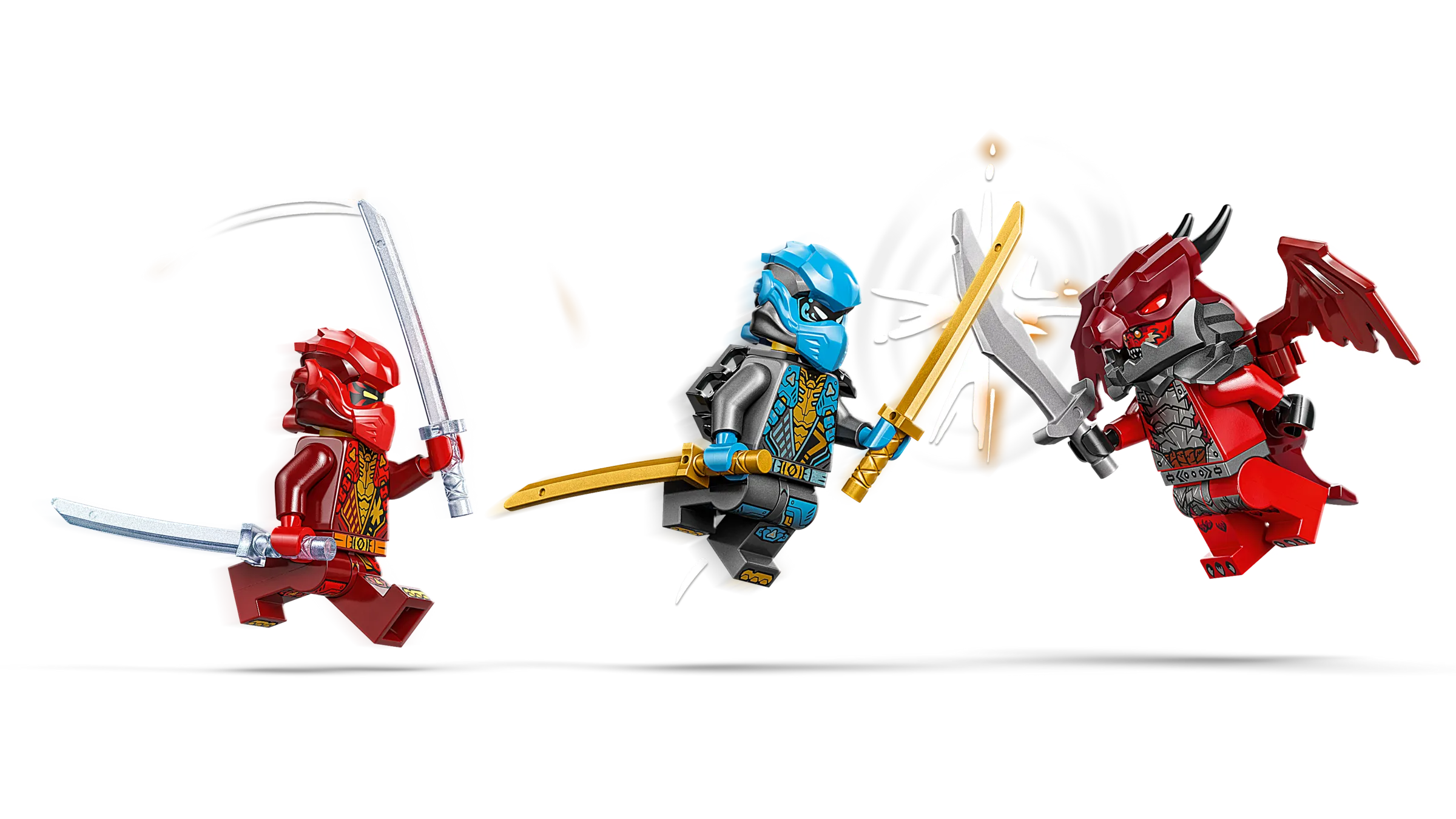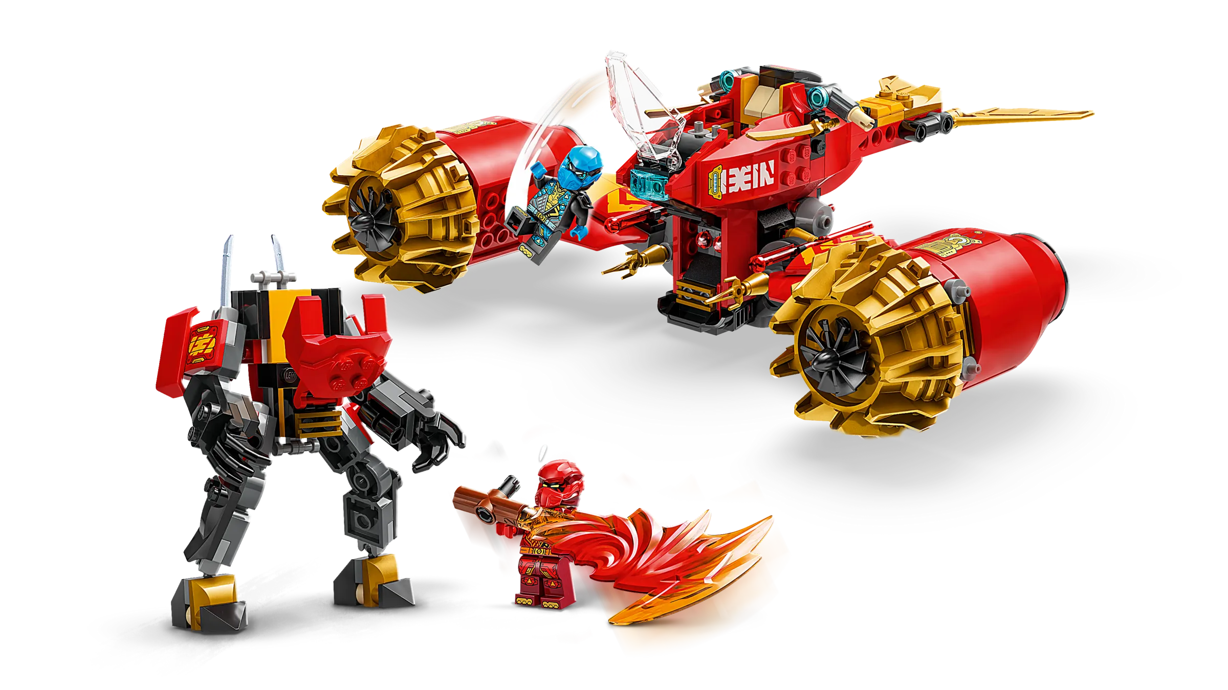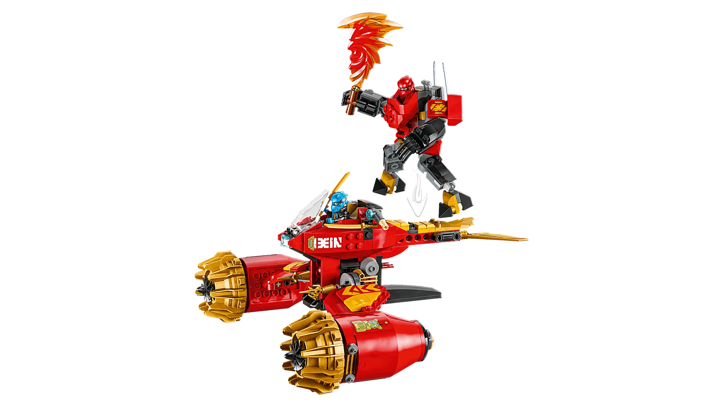 Join forces with Kai and Nya as they hurtle through a ferocious storm. In the skies above the NINJAGO® world, Nya is piloting her flying motorcycle while Kai is at the controls of his mech as together they form an awesome combined ninja vehicle! They also need to use their armory of katana swords and shooters to take down a dangerous Dragonian Warrior beneath them. Ninja teamwork must triumph!